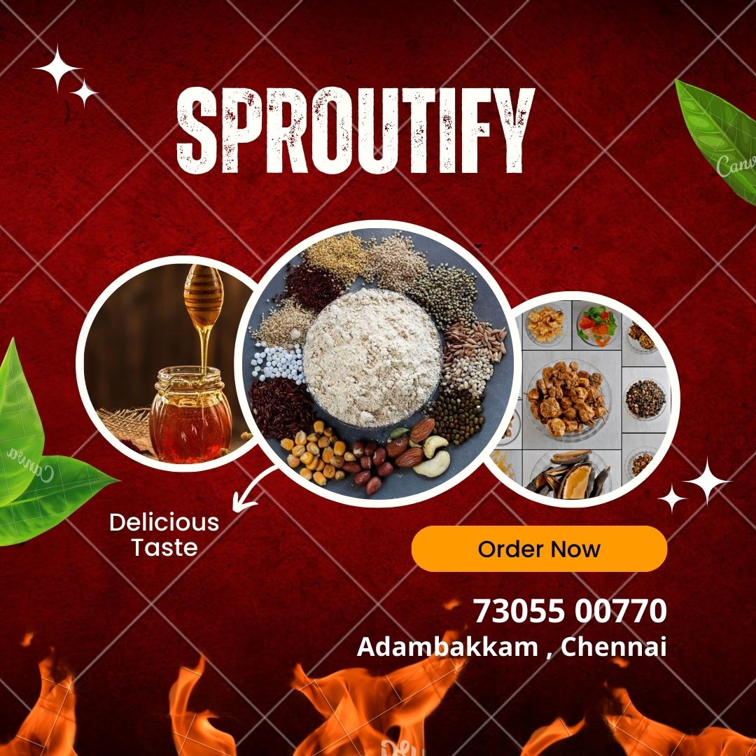 Founded with a passion for promoting wellness, Sproutify brings together tradition, nutrition, and innovation. With one year of successful service in Adambakkam, Chennai, we’ve grown from a small idea to a trusted brand for health seekers. We source only the best natural ingredients, support sustainable practices like solar drying, and deliver chemical-free goodness straight to your table.